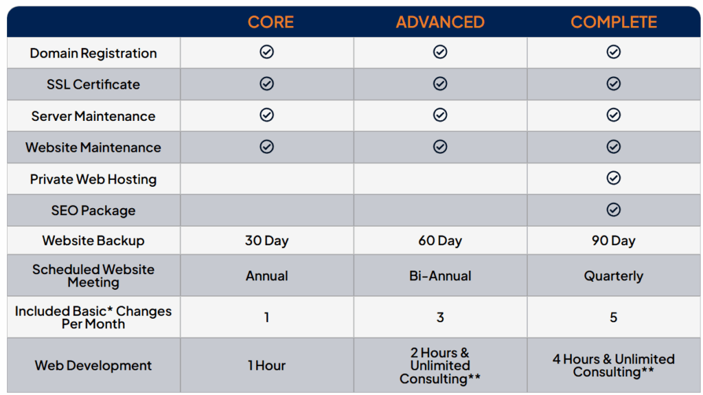 We understand that every business has unique online needs. That’s why we designed our Managed Web Services packages to support businesses of all sizes with flexible, reliable website management solutions. From domain registration and hosting to website maintenance, backups, and SEO, we provide the essential services needed to keep your business visible, secure, and performing at its best. With multiple service tiers available, you can choose the level of support that fits your goals—whether you need basic upkeep, advanced optimization, or complete website management with ongoing development and consulting.